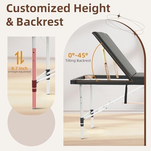 ABET Massage Table, 3 Fold Portable Professional Lash Tattoo Spa Bed, Height Adjustable 23.5″ Wide Compact Facial Table with Detachable Oil Pocket Towel Rod Face Cradle Armrest, Aluminum Feet & Black