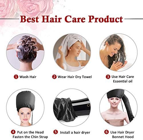 【Adjustable Hood Capacity】The adjustable side-located drawstring and the chin strap to ensure the hair drying bonnet does not come off during use, allows you to adjust the fit around your head size, hairstyle, hair accessories.