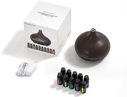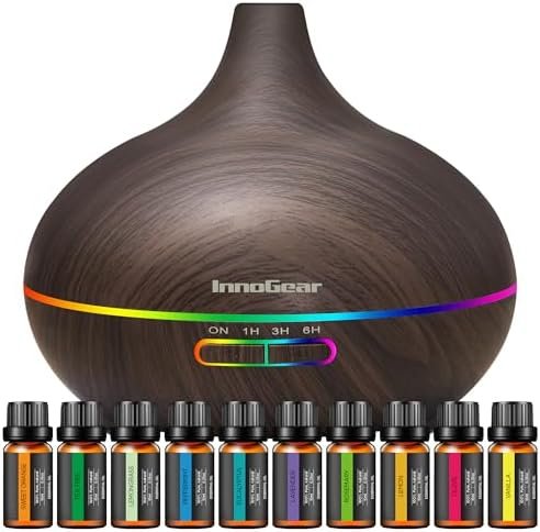 InnoGear Aromatherapy Diffuser & 10 Essential Oils Set, 400ml Diffuser Ultrasonic Diffuser Cool Mist Humidifier with 4 Timers 7 Colors Light Waterless Auto Off for Large Room Office, Dark Wood Grain