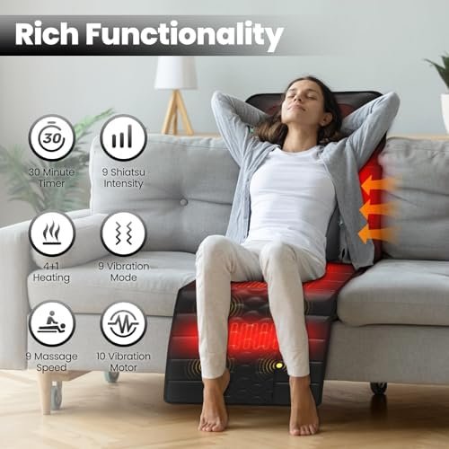 Customizable Massage Modes: Tailor your relaxation experience with 9 massage modes, 9 intensity levels, and 9 vibration styles. Whether you seek a full body massage or targeted relief for your shoulders, back, waist, or legs, this massage mat adapts to your preferences with ease. Separated Vibration and Heating Controls, Our massage mat boasts a user-friendly design that allows you to independently select between vibration and heating functions, catering to your individual needs for a truly customized experience.