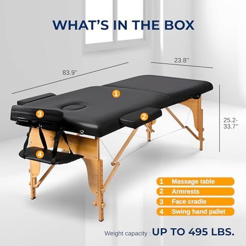 Indulge in pure relaxation with the SereneLife Travel Massage Table. Crafted for comfort and convenience, this massage tables portable professional grade folding bed is perfect for therapy, tattoos, spa treatments and more, whether at home, indoor or outdoors. Enjoy a plush experience with premium foam padding on our table massage. Adjust the height on this massage tables portable high quality and backrest for personalized comfort. Setting up is a breeze with its lightweight design and widened metal hinges on our wide massage table. Plus, it comes with a handy carrying bag for on-the-go use. Versatile and sturdy, this folded treatment table accommodates different positions and massage styles. Solid wooden legs and high-quality lock catches ensure stability for anyone up to 495 lbs. Experience luxury and ease with the SereneLife portable massage table lightweight – your ultimate relaxation companion. Technical Specs:- Bag Material: Ox-ford. Adjustable Height: 24” – 34.6” -inches. Maximum Angle: 55° (Backrest). Adjustable Design: 90° (Headrest). High Weight Capacity: Up to 495 lbs. Product Dimensions (L x W x H): 83.9’’ x 23.8’’ x 25.2-33.7’’ –inches