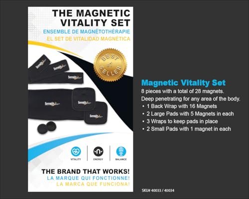 FULL BODY THERAPY: Eight-piece, easy to use set for convenient placement on key areas of the body. Contains back wrap with 16 sewn in magnets, two large pads with five magnets, two small pads with one magnet. Use the appropriate length strap to hold the large or small magnetic pads in place on the wrist, elbow, knee, ankle, head, neck etc.