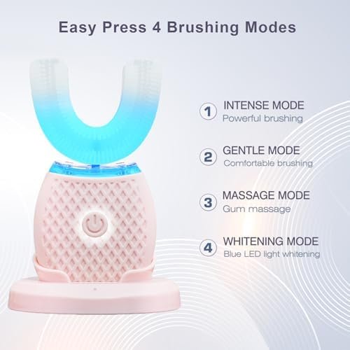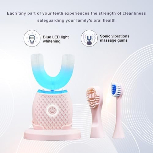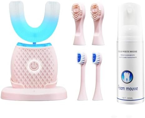 U-Shaped Electric Toothbrush for Adults with Foam Mousse, 4 Brush Heads, Auto 360° Ultrasonic Toothbrush with Blue LED Light, Hands-Free Smart Toothbrush Kit with Charging Base (Pink)