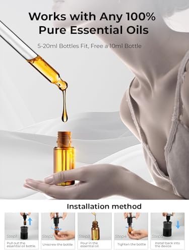 Universal Bottle Compatibility: The diffuser fits standard 5mL,10mL,15mL and 20mL US essential oil bottles. Just screw your bottle right on nozzle, or pour oil into the included bottle,Enjoy effortless, tool-free installation